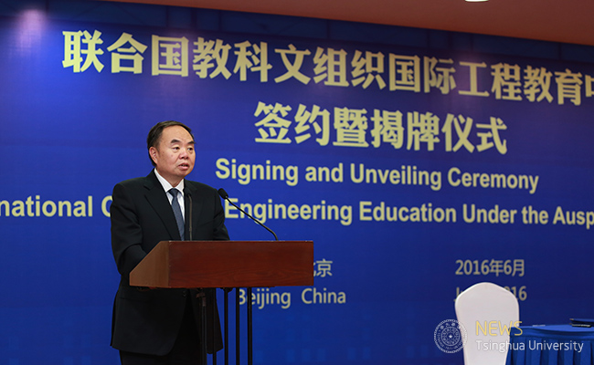 At this ceremony, Zhou Ji and Bokova signed the agreement on behalf of the Chinese government and UNESCO respectively. Zhou Ji, Bokova, Qiu Yong, and Wu Qidi inaugurated the International Center for Engineering Education together. Yuan Si, vice Chairperson of Tsinghua University Council and executive director of the International Center for Engineering Education of UNESCO, Qian Yi, professor of School of Environment and academician of the CAE, Wang Sunyu, secretary-general of the International Center for Engineering Education, etc. were present in this event.