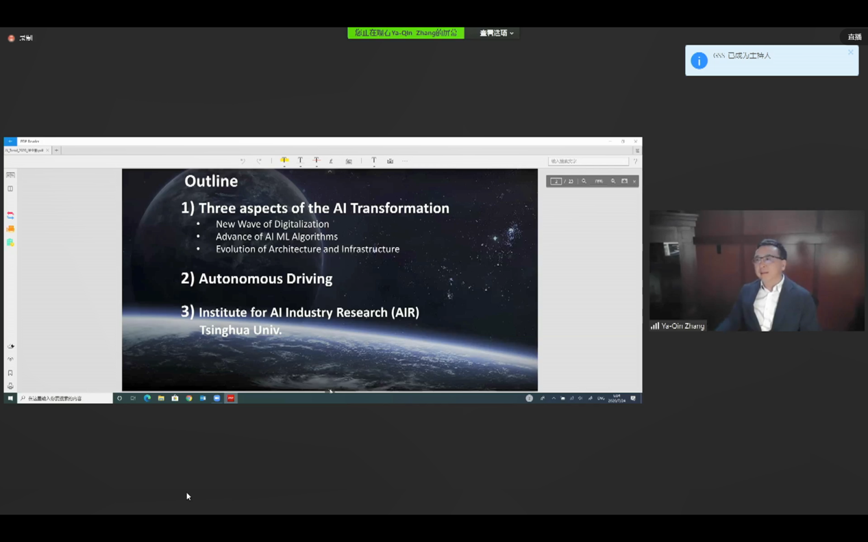 Dr. Zhang Ya-Qin, Dean of the Institute for AI Industry Research of Tsinghua University, former President of Baidu Inc., and former Corporate Vice President of Microsoft, gave a keynote speech entitled New Wave of AI Transformation. Starting from three different perspectives of the AI industry transformation, Dr. Zhang Ya-Qin analyzed the combination of information, material and biology in digitalization 3.0, and elaborated on the recent breakthroughs in machine learning algorithms and the evolution of computer architecture and infrastructure. He believed that autonomous driving is the future trend and the transformation of the automotive industry will mainly concern four aspects: electrification, autonomy, connectivity and sharing. Autonomous driving will integrate many key technologies and, after five stages of optimization and upgrading, it will eventually move from partial automatic to fully automatic, and from human control to automatic system operation, creating huge social and economic value.