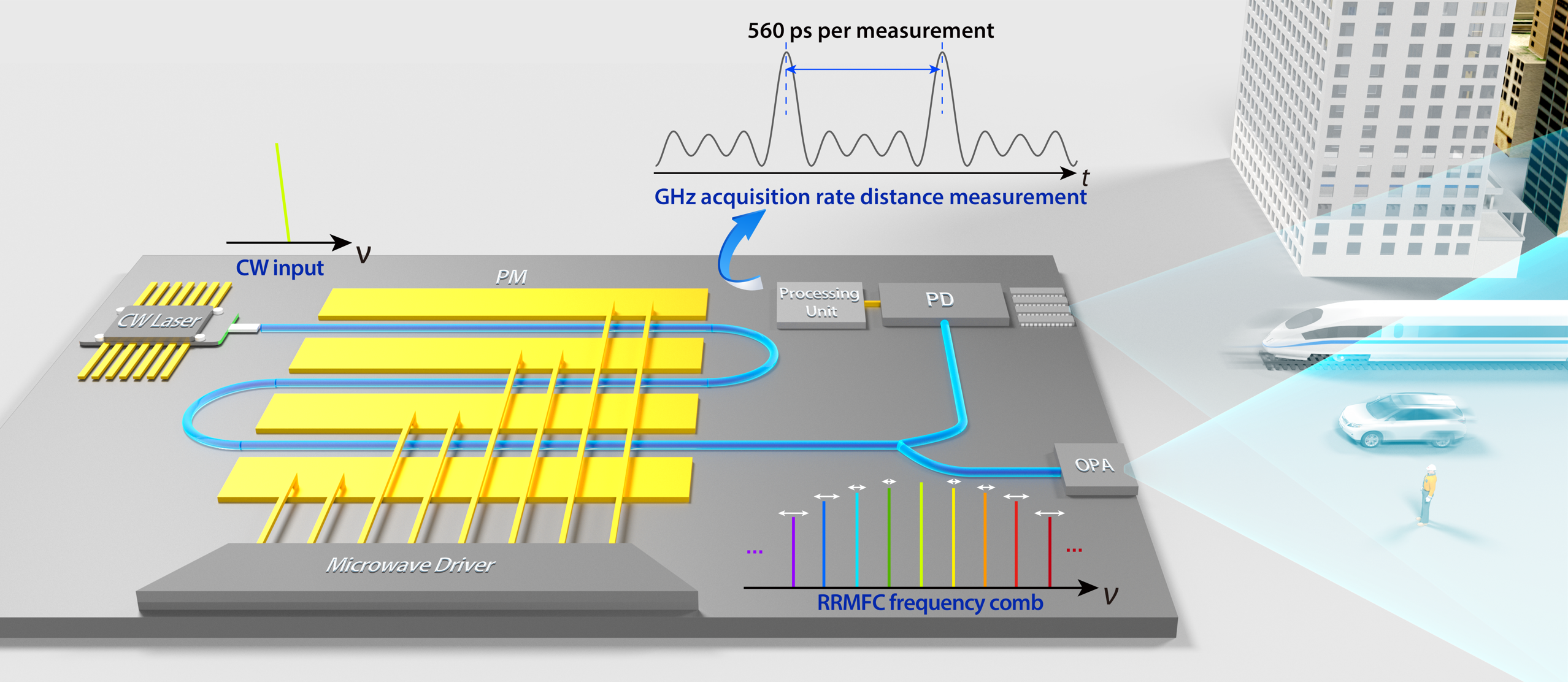 研究团队长期扎根于集成光学与精密测量的交叉学科领域,基于集成光学界的器件创新与精密测量学科中的方法创新,高度融合地完成了这一交叉学科的研究工作,实现了单通道1.79GHz的超高刷新率绝对距离测量。这一系统具有测距刷新率高、非模糊范围不受方法限制等优势,可以实现单通道的三维空间感知,有助于进一步提升车用激光雷达的点频和画面像素数,可实现对于远处小物体的感知(如突然钻出来的行人或自行车等),进一步提升智能驾驶系统的安全性。
