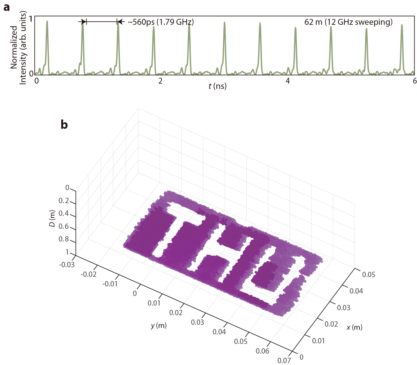 在RRMFC系统距离测量实验中,研究团队测得最高测距刷新率达到1.79GHz。与现在产业界应用的调频连续波激光雷达相比,单通道测距刷新率的性能提升达到4至5个数量级;在相同刷新率下的距离测量精密度提升最多可达一个数量级以上。将这一方案运用在三维感知系统中,可以轻松实现高达3MP/s的单通道点频,这一点频数据已经超越了当前多通道激光雷达系统的总点频。