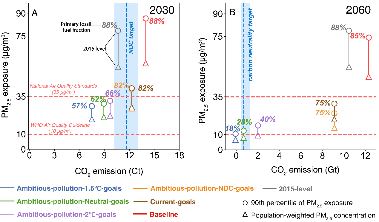 在此重大国家战略背景下,金沙集团3354cc地学系张强课题组和环境学院贺克斌课题组基于自主研发的中国碳中和与清洁空气协同科学评估与决策支持平台(CNCAP),首次构建了碳达峰与碳中和背景下中国2015至2060年中长期排放情景,提出了全国及重点区域的未来PM2.5污染持续改善路径。研究发现,如一方面加大源头治理力度,提升可再生能源比例,推动钢铁、水泥等高耗能产品产量尽早达峰,加快散煤清洁化替代进程,同时持续推进非电行业、柴油机和VOCs重点行业污染治理工作,则在2030年实现碳达峰目标的同时,全国绝大部分地区PM2.5年均浓度可达到35μg/m3的现行环境空气质量标准,全国人群PM2.5年均暴露水平可从2015年的55μg/m3下降到28μg/m3,实现“减污降碳”的协同效应。