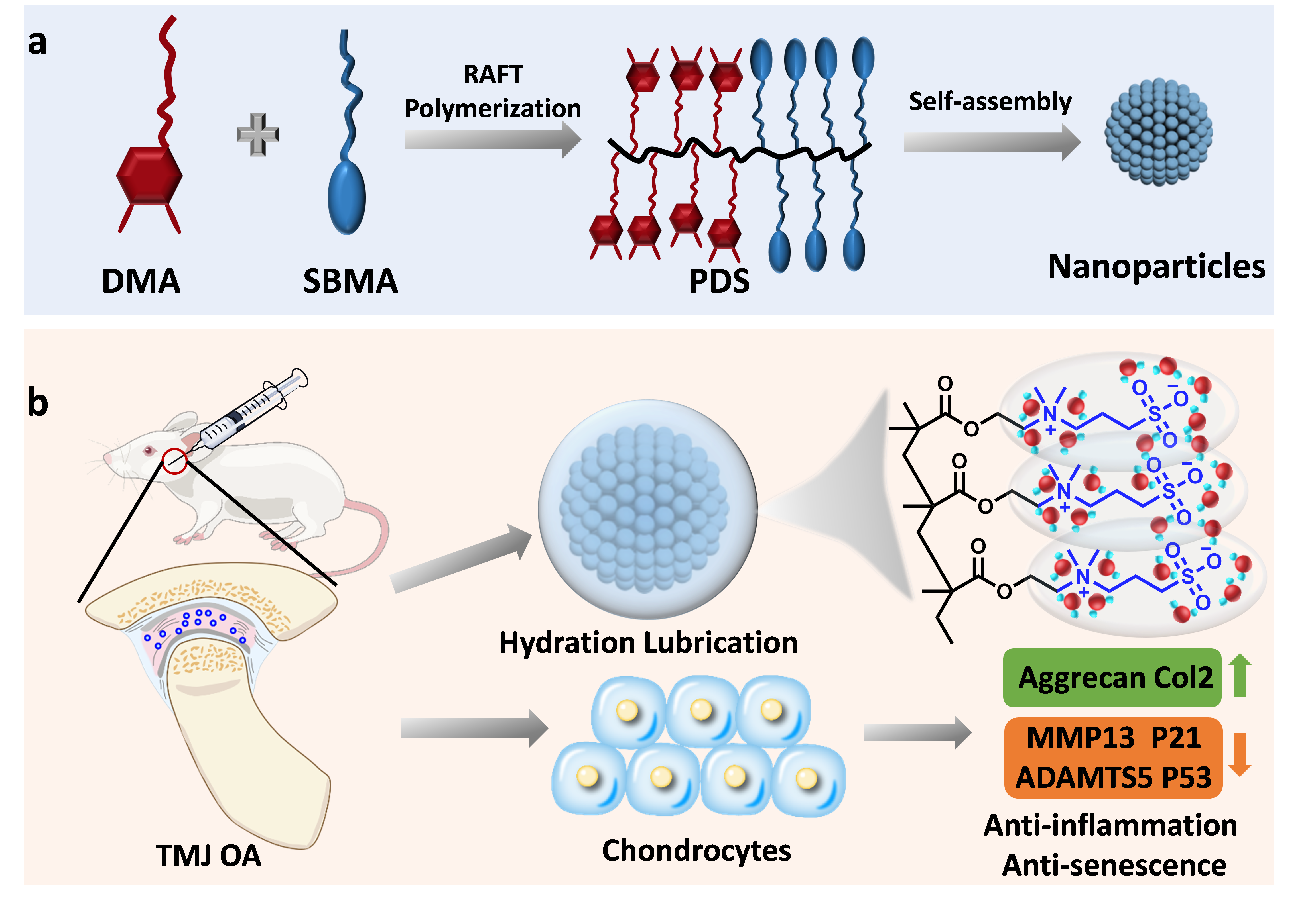 清华新闻网11月18日电 骨关节炎是一种由软骨磨损引发的骨关节疾病,可影响人体髋关节、膝关节以及颞下颌关节等多个关节,其发病机制与关节润滑功能丧失和机械过载相关。机械过载可导致炎症因子和分解代谢酶表达升高,诱导软骨细胞自噬和凋亡,从而使退化的关节软骨表界面摩擦增大,进一步加剧关节炎症,形成恶性循环。传统的关节腔局部注射药物方式存在功能单一、药物效率低等局限性,而短期内频繁给药会带来诸多不便。