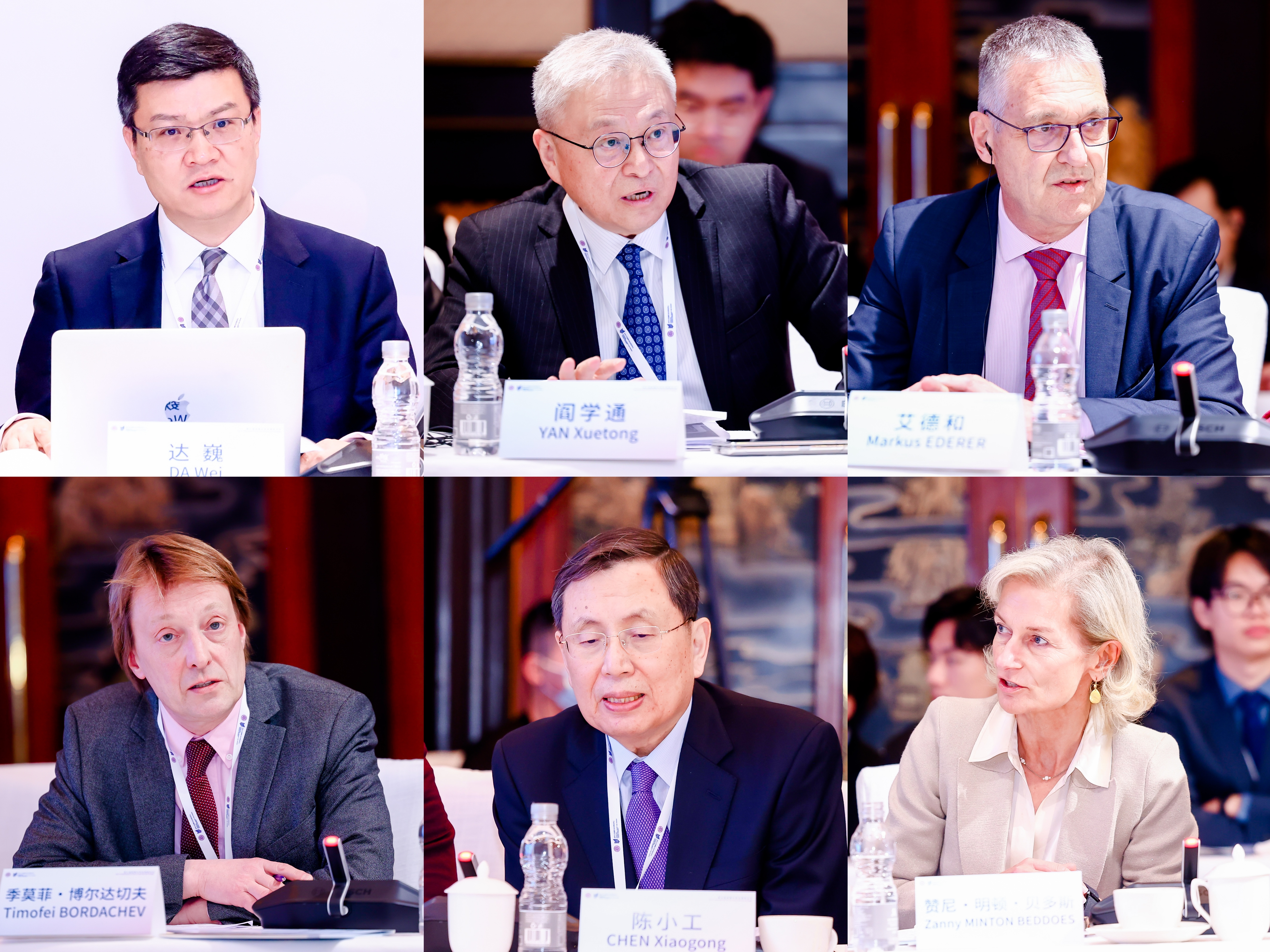 鞠建东、罗伯特·泰尔、格雷厄姆·艾利森、单叶骅分别作演讲(从左至右,从上至下)