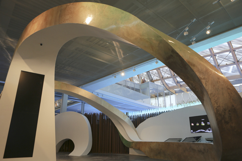 行走于三大展区之中,观众的视点不断变化,抬头看“天”,平视看“人”,俯看“大地”,不同的观看角度及方式,使展览变得更为立体。同时展览内容,抽象与具象的虚实结合也使展览更富于节奏。从三个展区的平面来看,“天”展区为正圆形,“地”展区为矩形方阵,而“人”展区迂回于“天、地”之间孕育生息。再一次隐喻了“天人合一”的核心思想。