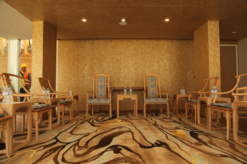 结合主题,在选材方面坚持可持续发展的环保理念,打造亲近自然的室内空间。主要四个空间为:一层开放用餐区、二层宴会厅、影音厅及贵宾室。一层开放用餐区的墙面选用了简单自然的OBS欧松板饰面,顶面为金属冲孔板,地面使用了抛光混凝土加树脂漆的淳朴材料,结合一望无际的“麦田”景观,凸显贴近自然的原生态设计理念。二层以“盛夏”为主题的宴会厅色彩热情浓郁,活动屏风的编制取自于民间的竹编图形,有贵宾入席时可将屏风围合展开,让每位宾客都能有中国用餐礼仪中讲究的“靠墙之位”,八方皆为上座,弘扬中华餐饮礼仪。影音厅以体现中国古代劳动人民智慧与勤劳的“梯田”为主题,在坡地上分段沿等高线建造的阶梯式“农田”与影音厅地面的座位有机的结合在了一起,取用我国特有的24节气中“春分.谷雨”为主题的地毯将地面装点得翠绿清爽,与叠起的“梯田”座椅相结合,让观众仿佛置身自然之中。巨大的无缝拼接led飞屏给观众带来最震撼的视觉享受。贵宾室的设计将土地与树的元素融入其中,配有“金秋”主题的地毯与“生生不息”主题的挂毯。在配饰方面融入了24节气元素进行色彩及意向图样的艺术创作,使中国独有的节气文化与室内展陈进行了艺术化的融合。