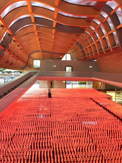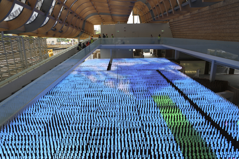 位于中国馆屋面最上层,是由竹条拼接的板材所组成的遮阳表皮系统。这是以参数化“写”出来的屋面,完全不同于传统的通过审美判断“设计”出来的形式。竹板编织的肌理顺着竹板的角度在屋面上“流动”,光线透过竹编表皮漫射进室内空间,在PVC表皮上布下的斑驳投影,随着季节和时间的变换而变化,这个造化自然的“空”,就是最最中国的空间。