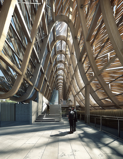 中国馆场地是一块南北向纵深的基地,游客由场地南侧的田野景观缓缓拾阶而下,“浸”入一望无垠的“麦田”景观,由中国馆东南角不知不觉地进入到建筑内部,顶部雄伟的坡顶暗示着内部戏剧性的空间体验;人们徜徉在流动的麦田装置之间,来到建筑二层核心部位的平台,回望楼下,映入眼中的将是由数万根LED“麦秆”阵列出的变化的壮美山河;影音厅位于二层流线的顶端,空间形态体现着平面和剖面布局中的巨大张力;观众随廊桥穿插回室内,将体会到整个建筑流线最高潮的部分——高耸的胶合木结构屋架构成的出口区,为观众提供了极具纪念性的空间体验。