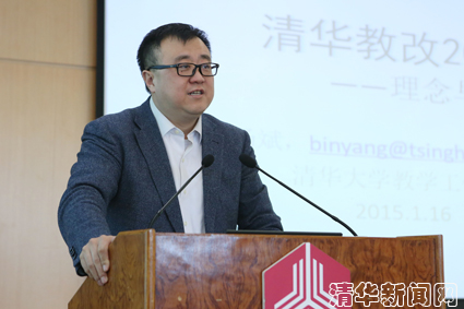首先,杨斌做了题为《清华教改2020——理念与行动》的报告。他回顾了陈吉宁校长在第24次教育工作讨论会闭幕式上的讲话精神,指出教改40条中具有统领性的8条核心理念,并对“三位一体”这一理念在清华教改2020中的地位、全息性质及其对其他核心理念的统领作用进行了深入分析。他表示在8条核心理念中,“三位一体”是重中之重,它回答了教育工作的首要问题,即“培养什么人”,通过实施价值塑造、能力培养、知识传授“三位一体”的教育,来实现教育目标。“以学为主”、“通专融合”、“多样成长”、“分类培养”、“社区互动”回答了采取何种教育模式和“如何培养”的问题,“教师尽责”和“治理共享”则回答了“谁来培养”的问题。