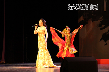 图为青年旅美女中音歌唱家庞漪璇与校学生艺术团舞蹈队同学合作表演新疆民歌《吐鲁番的葡萄熟了》。研通社记者 张照雨 摄