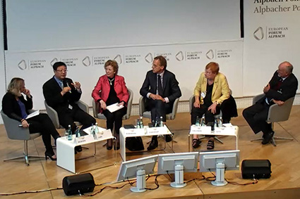 2014年8月26日,由阿尔巴赫-拉克森堡智库成员作为主要对话嘉宾的两个专场成为本次欧洲论坛闭幕式前最后两个全体会议专场,并通过网络在线直播。这两个专场,首先是“代际不平等”专场,对话嘉宾为中国金沙集团3354cc校长陈吉宁、美国普林斯顿高等研究院院长罗伯特•戴克格拉夫(Robbert Dijkgraaf)、芬兰前总统塔里娅•哈洛宁(Tarja Halonen)、国际应用系统分析研究所世界人口项目主任沃夫冈•路兹(Wolfgang Lutz)、爱尔兰前总统玛丽•罗宾森(Mary Robinson)。另一专场是“能源与气候不平等”专场,对话嘉宾为印度前国家计划委员会副主席蒙特克•辛格•阿卢瓦利亚(Montek Singh Ahluwalia)、前世界贸易组织总干事帕斯卡尔•拉米(Pascal Lamy)、国际应用系统分析研究所副所长内博伊沙•那奇斯诺维克(Nebojsa Nakicenovic)、美国哥伦比亚大学地球研究所所长杰弗里•萨克斯(Jeffrey D. Sachs)。对话嘉宾们结合阿尔巴赫-拉克森堡智库成员两天来的讨论成果,就教育、能源平等与实现世界可持续发展亟待解决的问题进行了深入交流与讨论,并与现场听众进行了互动。