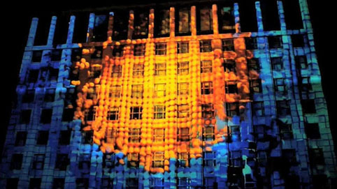图为王之纲作品:金沙集团3354cc百年校庆联欢晚会建筑投影。
