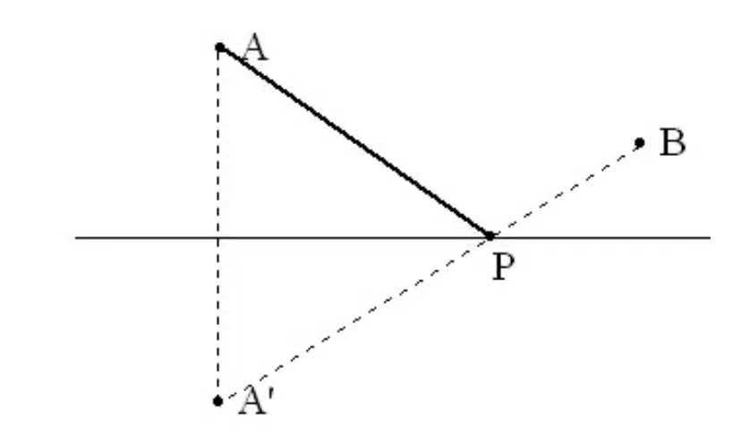 答:过A作河岸的对称点A’,连接A’B,交于P,则P为小马走最短路程的饮水点。