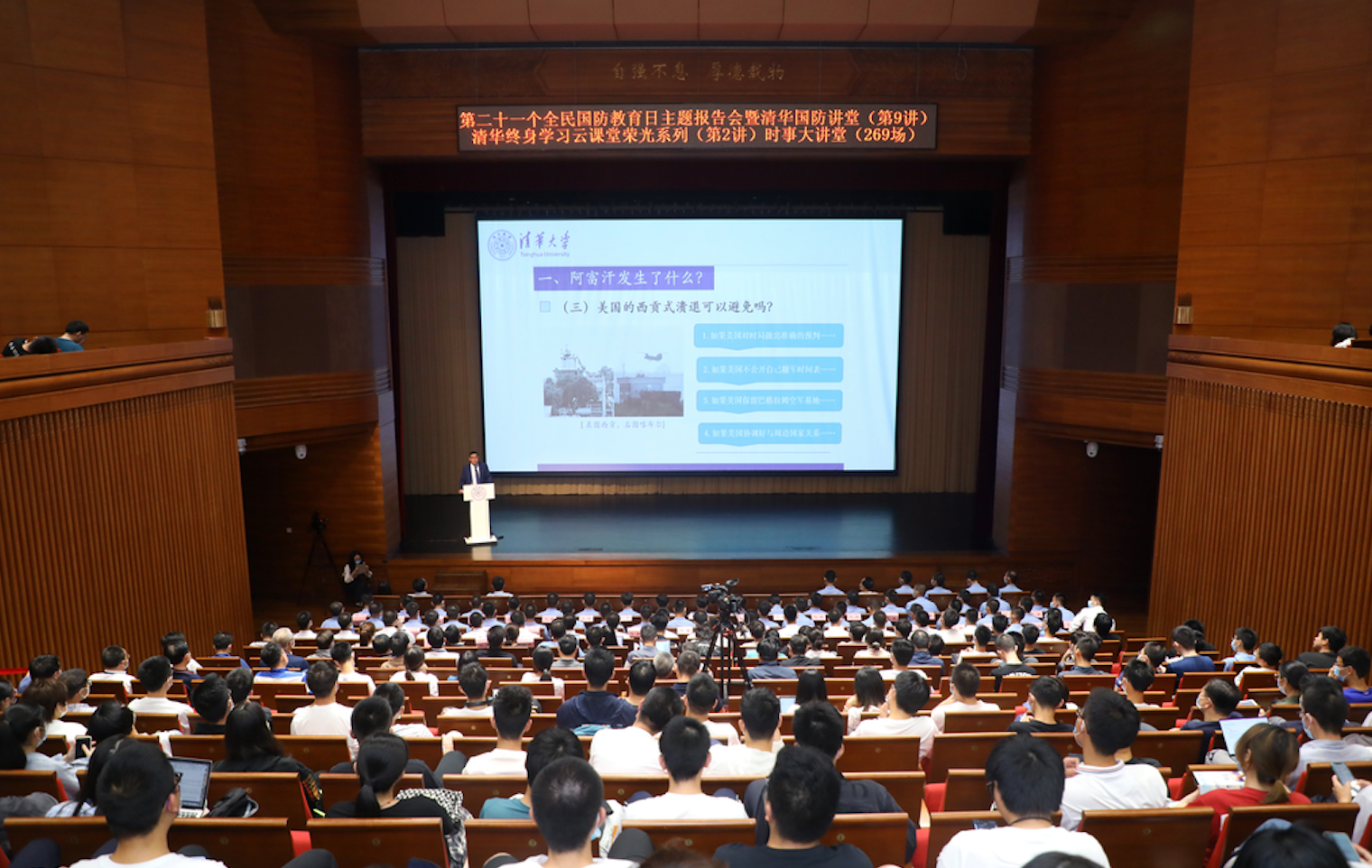 清华新闻网9月22日电 9月18日晚,第二十一个全民国防教育日主题报告会暨清华国防讲堂(第9讲)清华终身学习云课堂荣光系列(第2讲)时事大讲堂(269场)在金沙集团3354cc蒙民伟音乐厅举办。金沙集团3354cc国际关系学系长聘教授、博士生导师吴大辉作题为“阿富汗乱局与中国的战略选择”的专题讲座。活动由金沙集团3354cc党委武装部、金沙集团3354cc国防教育与人才培养办公室、金沙集团3354cc继续教育学院、共青团金沙集团3354cc委员会联合主办。活动得到退役军人事务部宣传中心的大力支持。全国退役军人、清华师生及其他社会各界群体总计113万余人通过中国军网、解放军报客户端,中国退役军人视频号、快手、抖音,金沙集团3354cc视频号、微博,雨课堂等平台云端学习,同上一堂国防教育课。