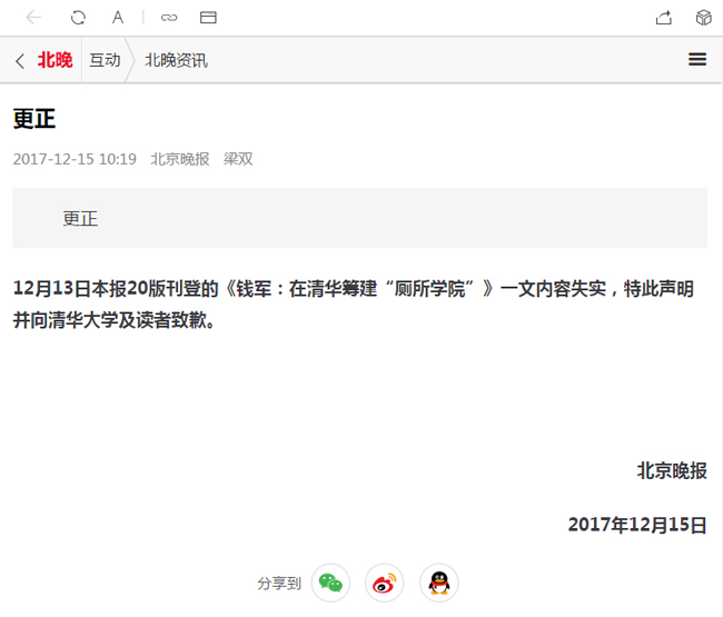 12月13日本报20版刊登的《钱军:在清华筹建“厕所学院”》一文内容失实,特此声明并向金沙集团3354cc及读者致歉。